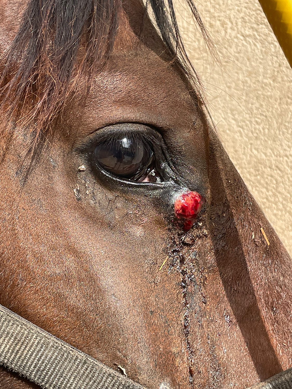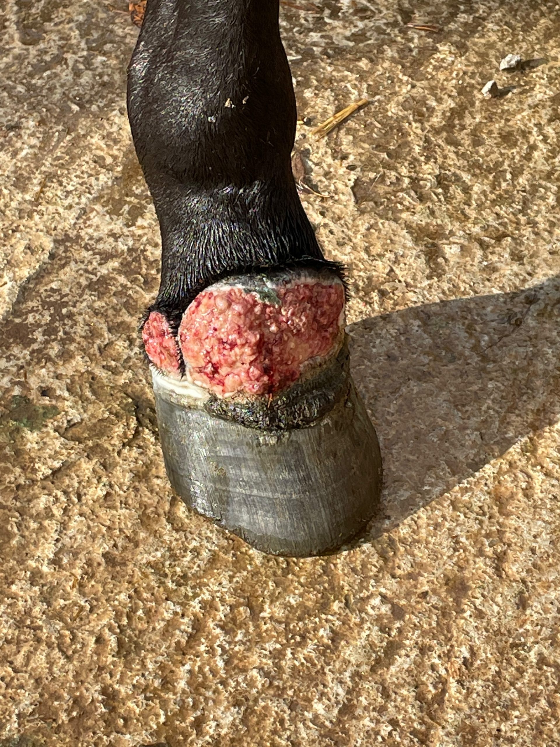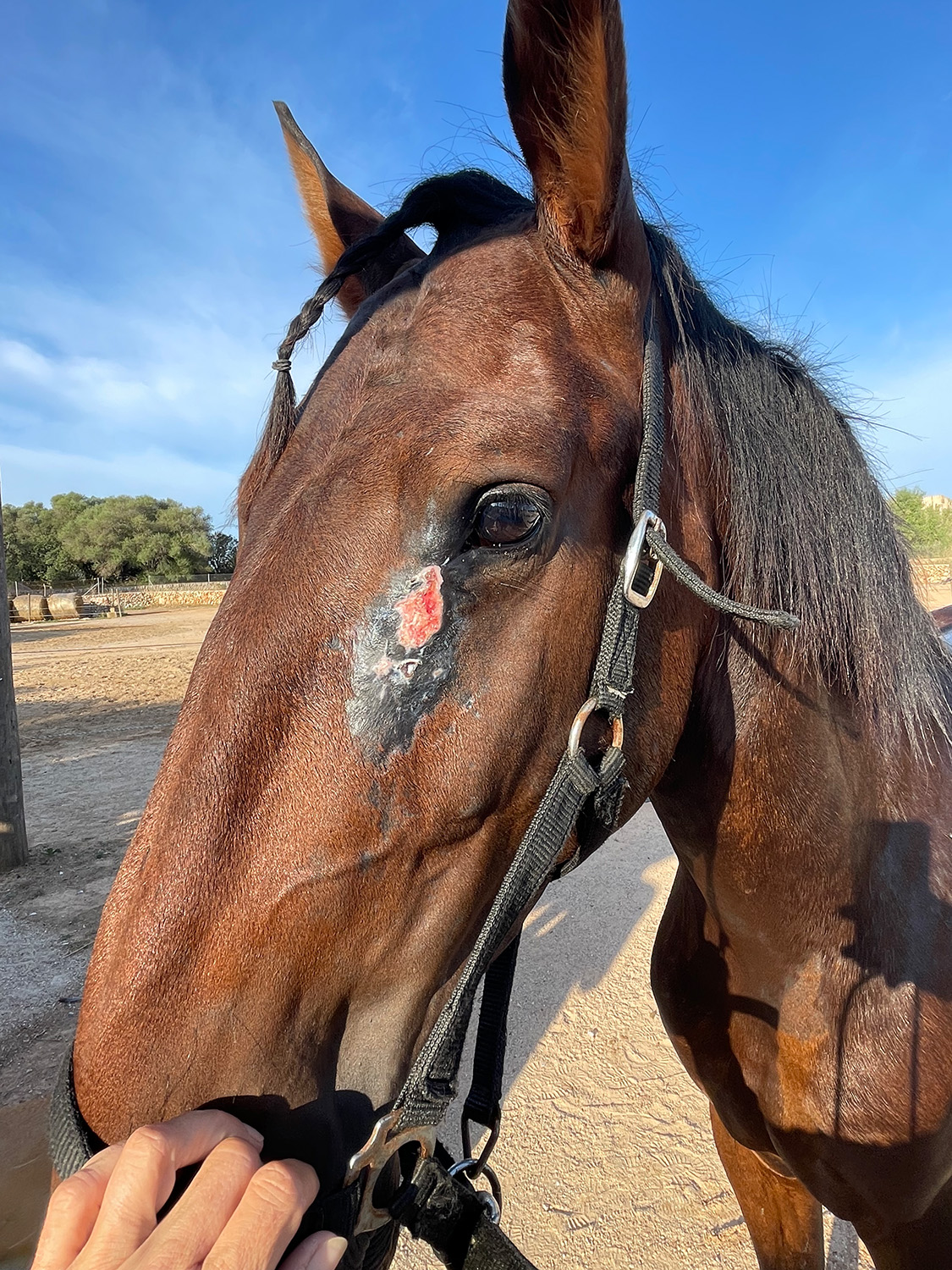 Así que viajé hasta allí y conocí al joven semental. Un alma de caballo con mucho dolor y heridas en las patas y en la cara. Una enfermedad de la piel causada por larvas de mosca que es difícil de tratar y eliminar a largo plazo… llevaban 3 meses intentando controlar esta enfermedad sin éxito. Me pidieron ayuda porque no sabían qué hacer. Me permitieron llevarme a Buba a casa y luego consulté varias clínicas, veterinarios y soluciones alternativas.